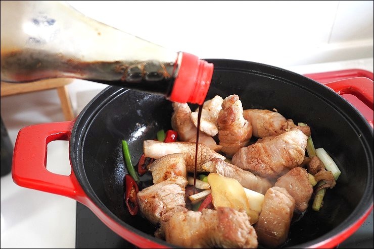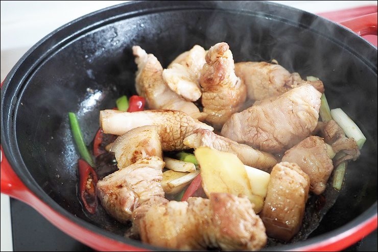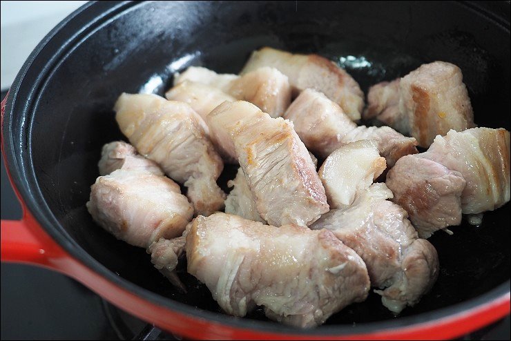再把微煎過的豬肉塊放進鍋,加醬油、冰糖、水。
