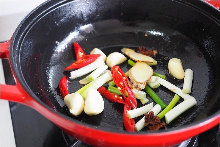第一鍋先來個下飯的滷肉吧!敢吃肥的用五花肉,不敢吃肥肉就買瘦肉,然後一定要帶皮,帶皮補充膠質!先把肉切塊並下鍋微煎,鍋不用放油,熱鍋直接放進去煎,表面有點赤赤就可以先起鍋,這樣之後滷才會香!接著利用鍋裡剛才煎肉的油,直接爆香蔥段、蒜頭、薑片、辣椒、八角。