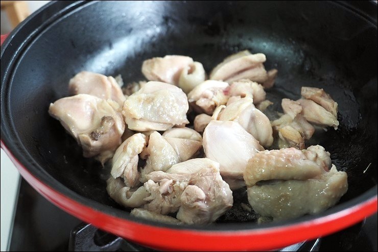雞腿腿肉切塊下鍋煎一下,這樣肉才會比較香,煎完先拿起來備用,另外,我二哥家喜歡吃雞胸肉,雞肉就要晚點放才不會煮到乾柴。
