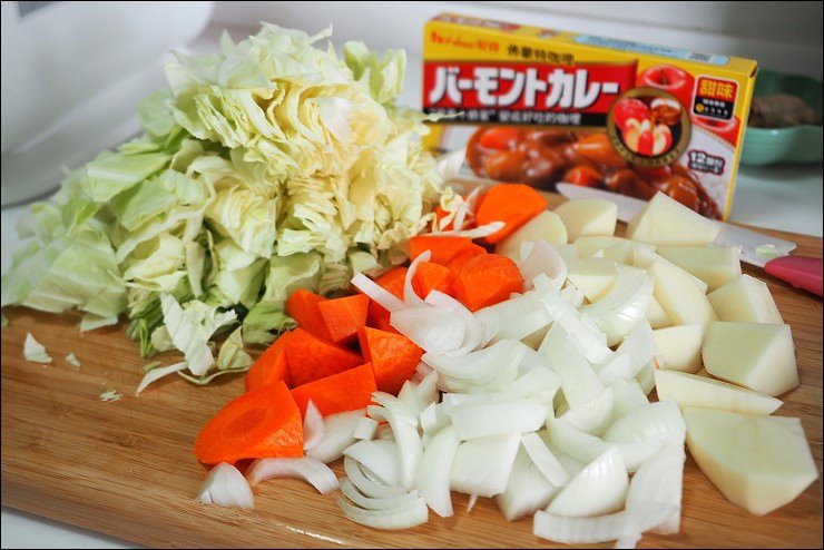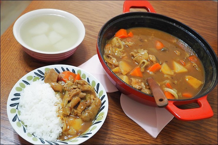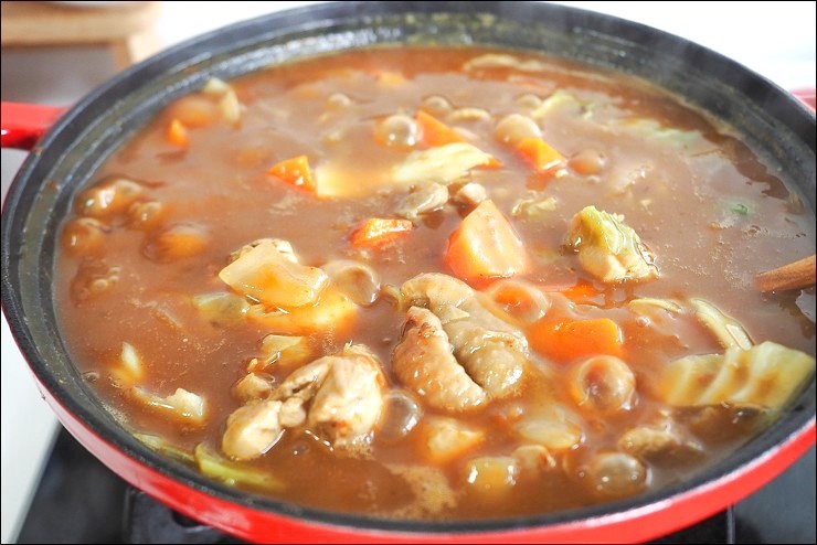 第二鍋出咖哩雞也是一鍋到底,我喜歡吃肥嫩嫩的雞腿,到雞肉攤請店家幫忙去骨,骨頭之後可以熬湯,料的話也是想吃到多些菜,有加紅蘿蔔、馬玲薯、洋蔥及高麗菜。