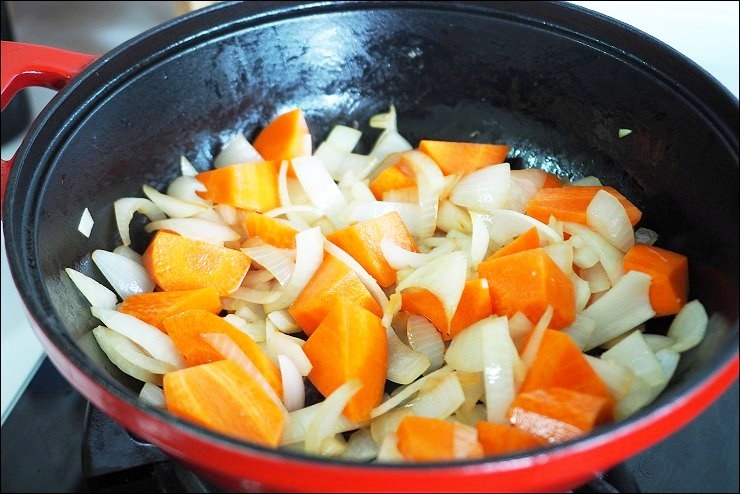 利用剛才煎雞腿肉的雞油來炒洋蔥、紅蘿蔔跟馬玲薯。