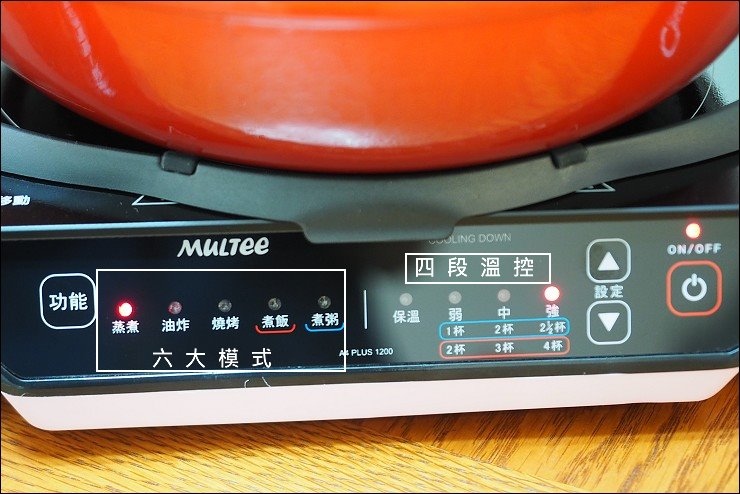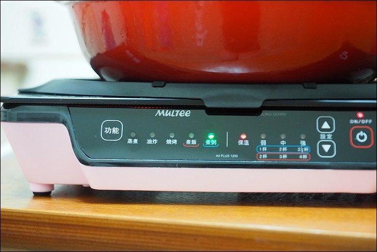 若是煮飯、煮粥,則視米飯的杯數來選擇火力,煮飯看紅色,若是煮二杯米,就選弱,若是煮二杯粥,就要選中火力,直接一鍵按下煮到好。