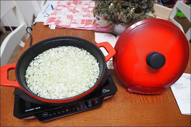 再來試試煮飯或煮粥的智慧功能,剛好最近張阿公牙齦發炎不好咀嚼,煮軟軟的粥吃最好了,我跟小阿弟也可以跟著吃。說明書有煮飯跟煮粥的米跟水的黃金比例,我接用水:米以1:5的方式煮粥,米跟高麗菜切碎放進去,選好功能跟火力即可蓋鍋。煮粥用什麼鍋都行,粥有軟爛都好吃,但煮飯因為米粒軟Q度很重要,建議搭配摩堤20公分鑄鐵圓鍋。