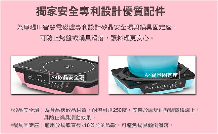 獨家安全專利設計的鍋具固定座及戨晶安全環,可以避免鍋具傾倒滑落。