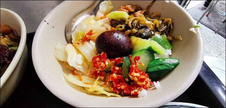一些高麗菜、酸菜、大片菜脯及小黃瓜吃起來清爽不油膩,吃完這一碗一點都沒有負擔,我們一人還狂喝三碗大骨湯,好滿足。