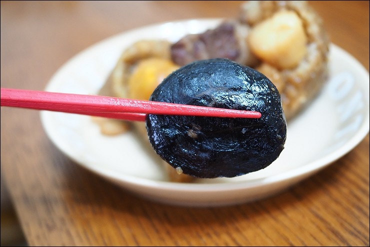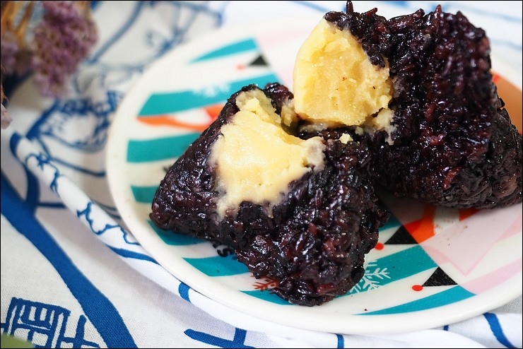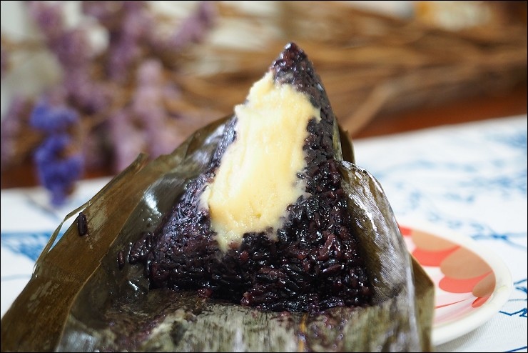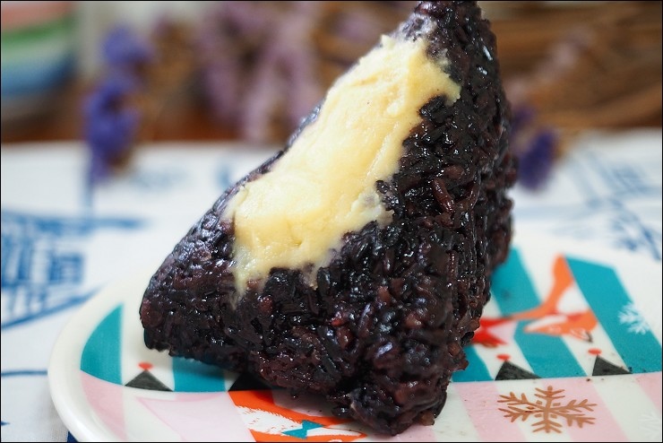 粽子不是只有鹹口味,也有甜口味的唷,吃完二款好吃的鹹粽子之後,來吃吃奇華的紫米豆沙粽,米是糯米混紫米,健康又養生,口感綜合二者的Q彈口感, 內餡是甜而綿密的綠豆沙, 鬆綿的綠豆蓉讓紫米粽吃起來更順口,外Q內軟不甜膩,相較於鹹口味油香的肉粽來說,這顆是走清爽路線。
