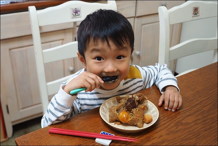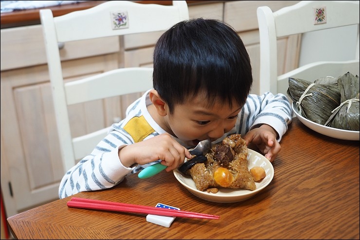 我吃粽子喜歡包蛋黃,家裡有的人不愛,允嘉阿嬤有幾年都不包蛋黃搞的我跟她鬧皮氣沒包蛋黃我不吃!阿嬤只好客製化我的粽子,就是會幫我 包鹹蛋黃,粽子裡有包蛋黃才好吃嘛!打開奇華粽子裡這一大顆鹹蛋黃立馬加分,當然會進我肚子啦,誰都不能跟我搶,嘿嘿。