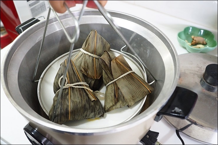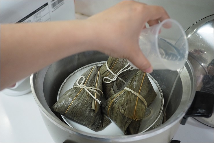 冷凍的奇華五月粽不退冰進電鍋官方建議4杯水,若是冷藏則是三杯水,放進電鍋等跳起來再悶十分鐘就能開吃真方便,蒸的時候不斷飄出迷人粽香。
