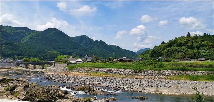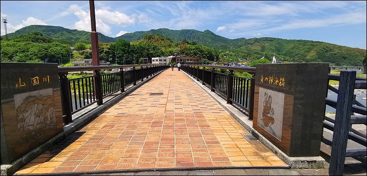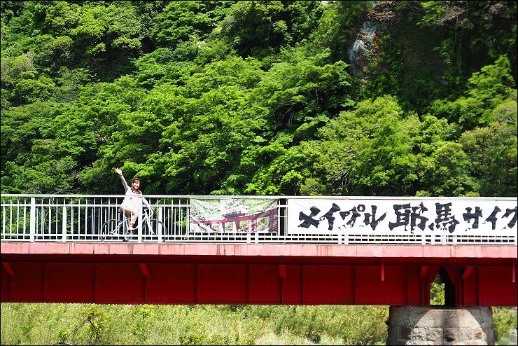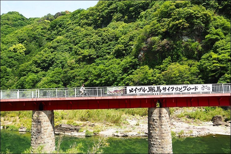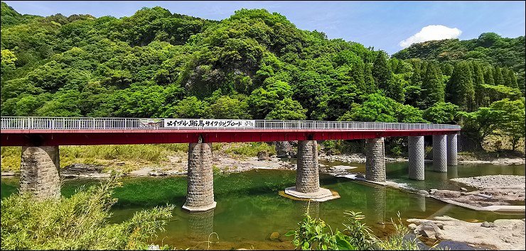 我們從耶馬溪自行車站出發,約1.2公里10分鐘的路程來到第二山國川橋,這原是建在山國川上的舊鐵路橋,橋上的布條還有當時火車在開的照片,石造的橋墩與紅色的橋樑在群山綠草與河中間相當出色。