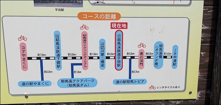 從第二山國川橋到平田宿場約3.7公里,20分鐘腳踏車程,這站原本有火車在走的時候是平田車站,但耶馬溪鐵路廢棄之後,平田車站改建為自行車休息站,保留舊平田車站的建築,還設有洗手間方便遊客使用。
