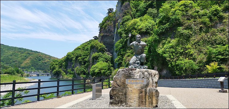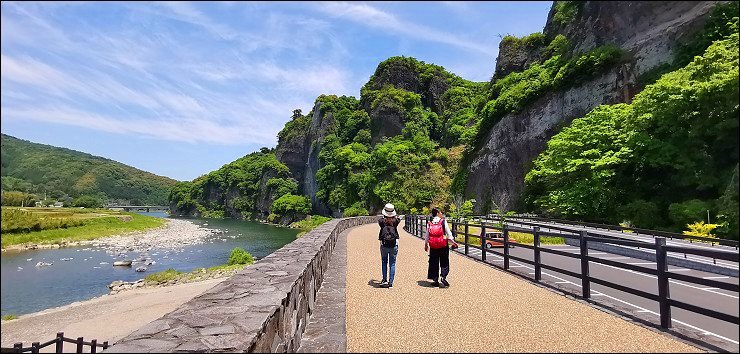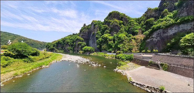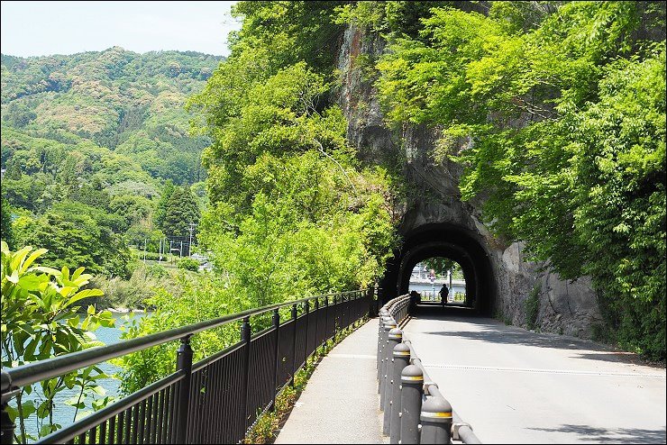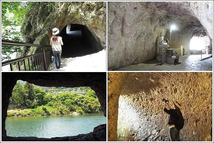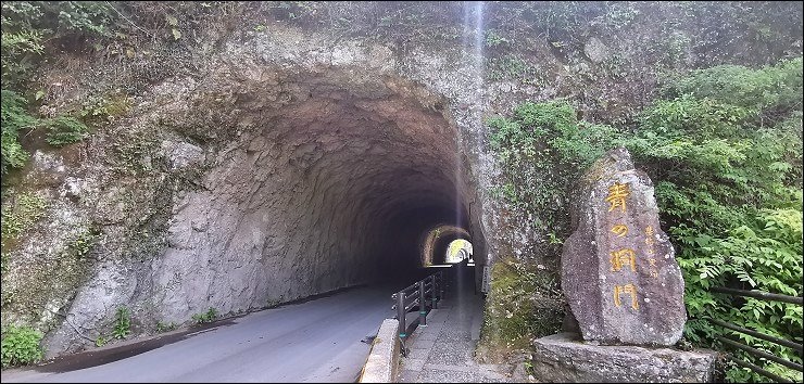 還車後步行到青之洞門,青之洞門位於競秀峰下,全長約342公尺,隧道部份約144公尺,這裡原本是一座岩山完全沒有路,禪海和尚取得中津藩許可及資助後雇用石工開鑿,一點一滴花了三十年才開出隧道,改善了這區的交通,據說當時為了募集資金,要通過隧道需要收費,成為日本第一條收費道路!