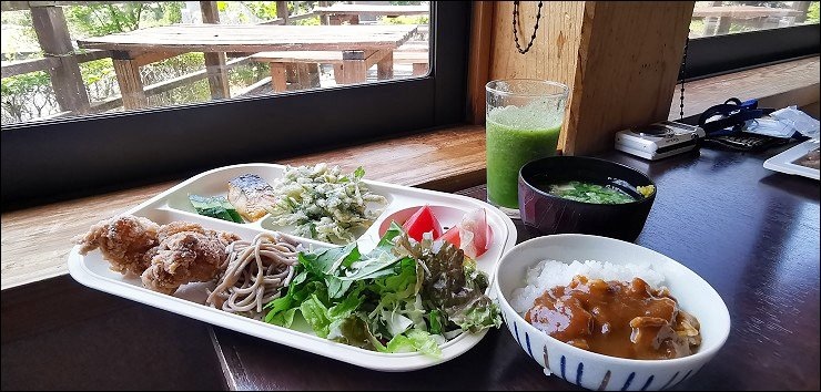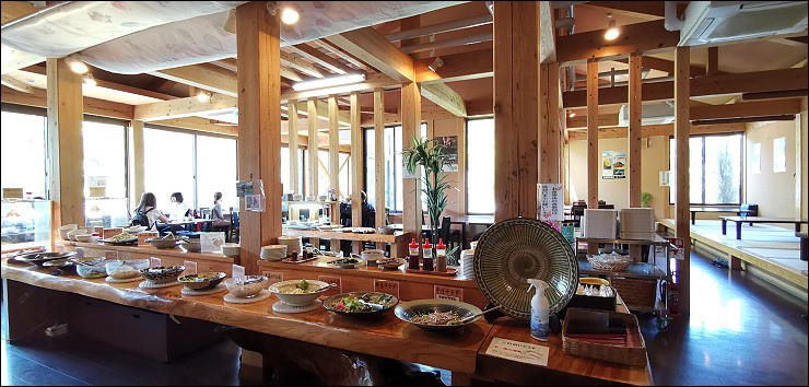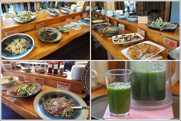 騎車有運動到大家都餓了!中午在農家餐廳洞門Patio用餐,吃到飽費用大人是1295日圓含稅,小學生850日圓,4歲以上850日圓,3歲以下免費,主打當地盛產的野菜及季節交替食材,自助取餐想吃什麼自己夾,不瞞大家,我們每個人都吃了滿滿二盤,價格經濟實惠,飲料吧有店家特製的小松菜蔬果汁及紅茶、咖啡155日圓隨你喝,大推小松菜蔬果汁,我足了三杯晚上回飯店很順暢,舒服~