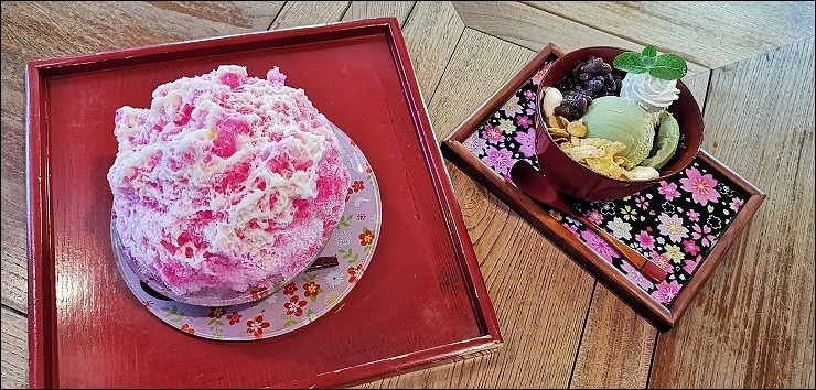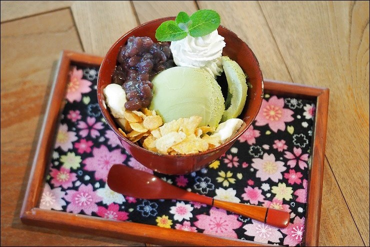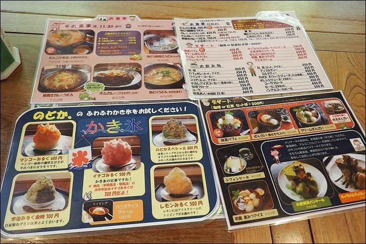 這裡有提供正餐餐點,我們中午吃了農家菜,我們簡單點甜點、咖啡,抺茶冰淇淋還不錯吃,另外同行朋友點了大受日本小朋友歡迎的草莓冰,很像挫冰淋了草莓醬。