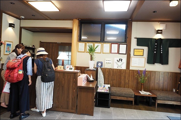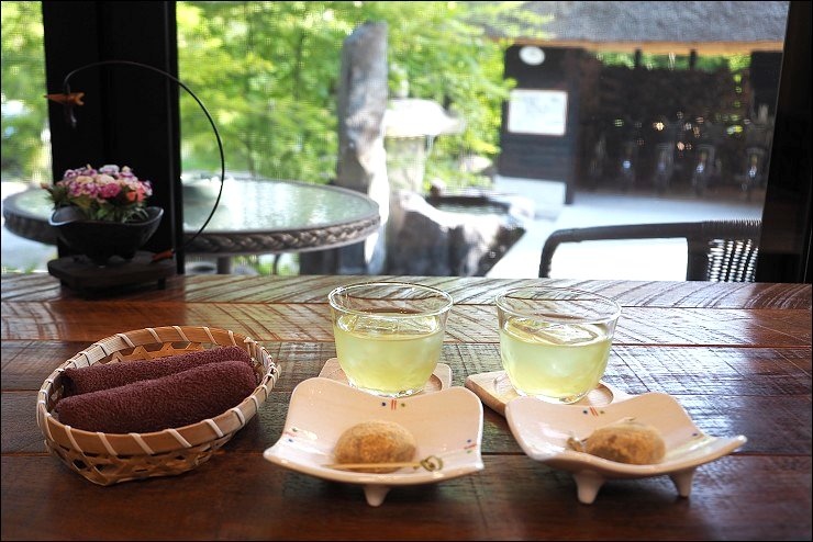 這次我們是租車自駕過來由布院,飯店有免費停車場可停,若沒開車的旅客,可事先寫信或電話預約JR由布院站免費來回接送,JR到由布院站,進到大廳辦理入住手續,服務人員立馬送上毛巾、冰茶及小甜點,清涼消暑。