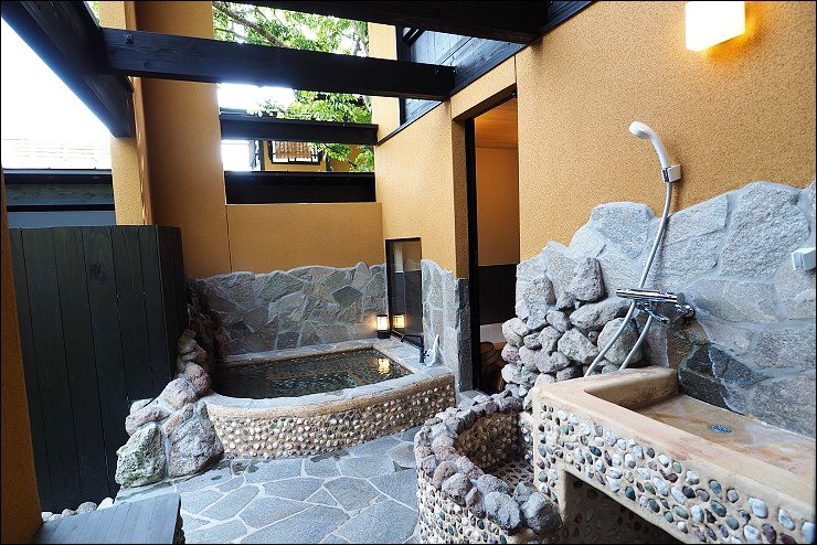 這是飯店的露天風呂,不需預約登記,只要看到燈沒亮就可以進來泡湯,燈亮表示有人在使用,不過因為每間獨棟的房間也都有獨立的露天風呂,我們就都在房間泡湯懶的走出門啦,當然這裡空間更大!