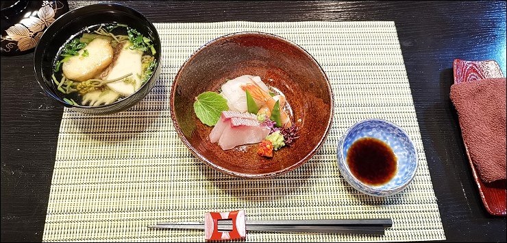 生魚片、鯛魚湯,這道一吃我跟友人異口同聲說,點個酒來配一下吧!來個燒清酒好適合,清爽微甜(警語:喝酒不開車,開車不喝酒)。豐後牛富含油脂,入口即化,滿足!