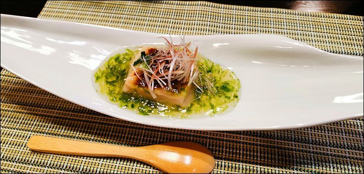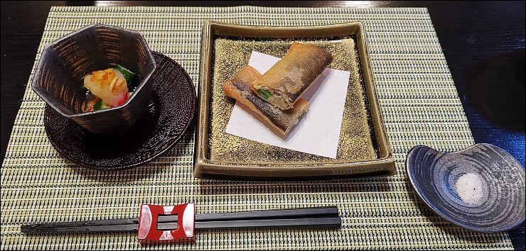 溫豆腐的口感有點像麻吉稠稠黏黏的,上頭有加味噌醬提味略鹹,很快被我清盤。炸物是很厲害,是廚師手工把香魚去刺,捲在春捲皮裡面,有加起司跟彎豆,這種就是現炸現吃最美味,香酥好吃,起司味道不明顯,但吃起來口感滑順,腕豆有脆有汁,恰到好處,沾點旁邊的山椒塩好搭,我超愛!搭配蘿蔔泥醋、小黃瓜等小漬物,清爽好吃,怎麼覺得愈吃愈開胃。(查房價:https://reurl.cc/6YVGk )