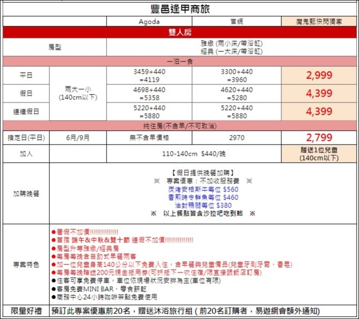 端午連假還沒找到飯店的團員照過來!台中豐邑逢甲商旅限期一天半超級快閃來啦~豐邑逢甲商旅是台中逢甲夜市質感住宿首選高CP值飯店,走路三分鐘就到台中逢甲夜市,有網友說一出門就是明倫蛋餅XD,媲美星級飯店超豐盛早餐,各大訂房網超高評分住宿,google評價4.4顆星、agoda評價8.9分。這次的台中豐邑逢甲商旅限期一天半超級快閃,專案優惠內容更勝官網和線上知名訂房系統,暑假不加價,端午&中秋&雙十節連續假日視同一般假日加價,請先搶先贏!雙人房型升等為帶浴缸的雅緻雙人房(二小床)/經典雙人房(一大床),加一位兒童身高140公分以下免費入住,含早餐與兒童備品(兒童牙刷牙膏、香皂),雙人房和四人房指定日破盤價快閃團再下殺,每房每晚贈送200元現金抵用券(可折抵下一次住宿/限直接跟飯店訂房),住客可享免費停車,車位依現場狀況安排為主(車位有限),假日提供晚餐加購專案優惠(單點主餐含沙拉吧吃到飽),客房免費MINI BAR零食餅乾,商務中心24小時咖啡茶點免費使用,易遊網獨家高鐵票價79折(需於線上訂房時一併訂票),預訂此專案優惠前20名,贈送沐浴旅行組 ( 前20名訂購者,易遊網會額外通知),台中逢甲夜市平民小吃高CP值住宿吃貨小旅行就靠這檔,免開車吃飽喝足涼涼仔散步XD