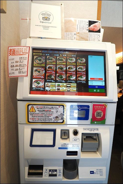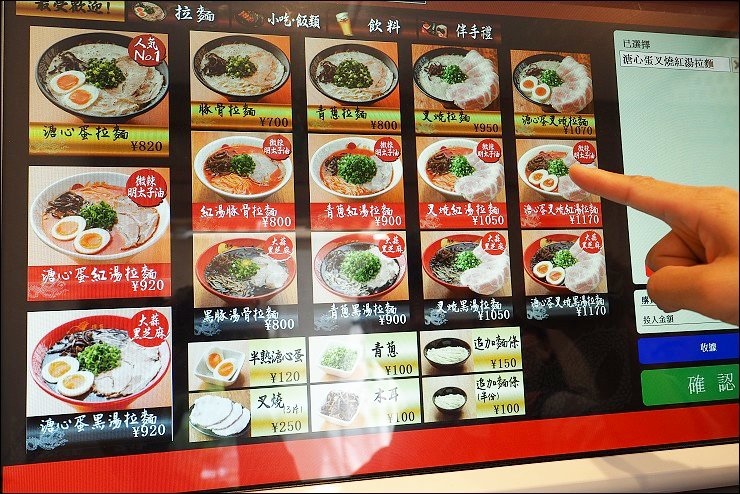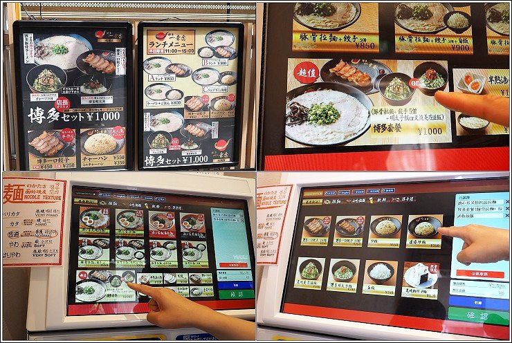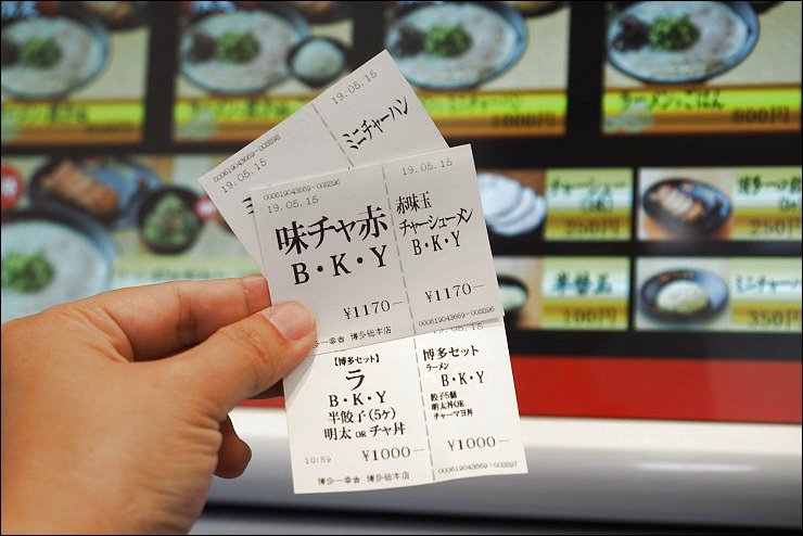 推開門進店先聽到店員熱情的招呼聲,到食券機先買餐券,日本很多飲食店都是這樣,客人自行投幣買餐券,菜單都有圖片說明,選單有日文、英文、中文繁體、中文簡體及韓文五種語言。博多一幸舍拉麵有三種湯頭,分別是豚骨白湯、紅湯及黑湯,不只有拉麵可以,另外還有一口吃餃子、炒飯、明太子飯及美奶滋叉燒飯可選,投下鈔票點好想吃的餐點,拿著餐券就可以入座啦,店員會照餐券出餐。