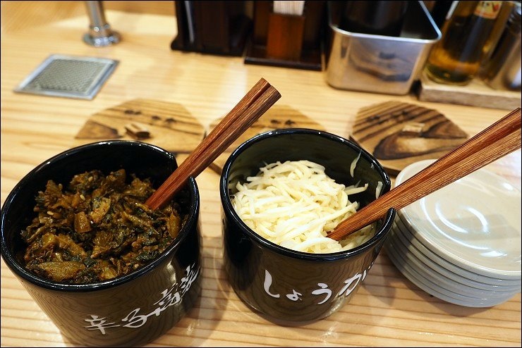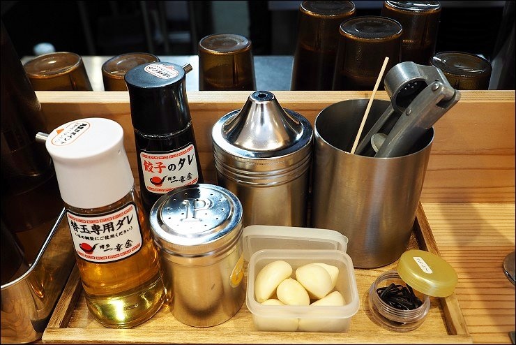 桌上備有各式調味料,沾餃子的醬油、蒜頭、薑絲跟辛味高菜,薑絲不是用紅薑,味道不會很重,我很愛九州特色高菜,有點像台灣的酸菜,博多一幸舍的高菜算是我吃過辣度算高的,加進拉麵配著吃很過癮。