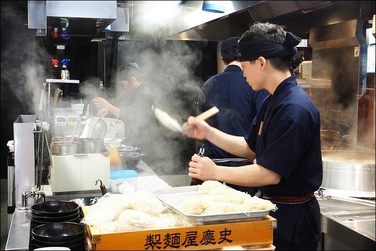 吧檯最棒的是可以近距離欣賞店家製作過程,師父手超靈活,手勢一個翻轉,麵就跳起來去掉多餘的水份,入碗後加入叉燒等食材,即完成。