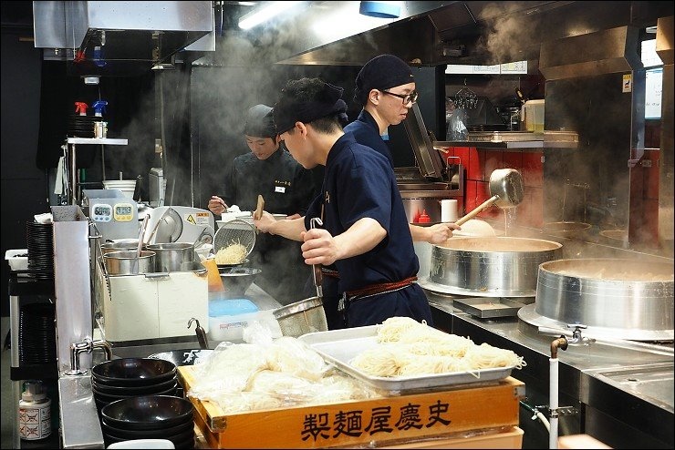 博多一幸舍總本店的湯頭有三大鍋,營業時間不停火,不是讓整鍋老湯一直滾,而是會持續在老湯內加入新湯下去煮所創造出來的美味,三大鍋就是拉麵的靈魂湯底,店裡充滿濃濃的豚骨湯味。