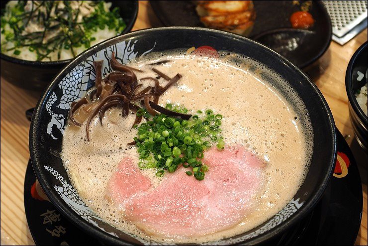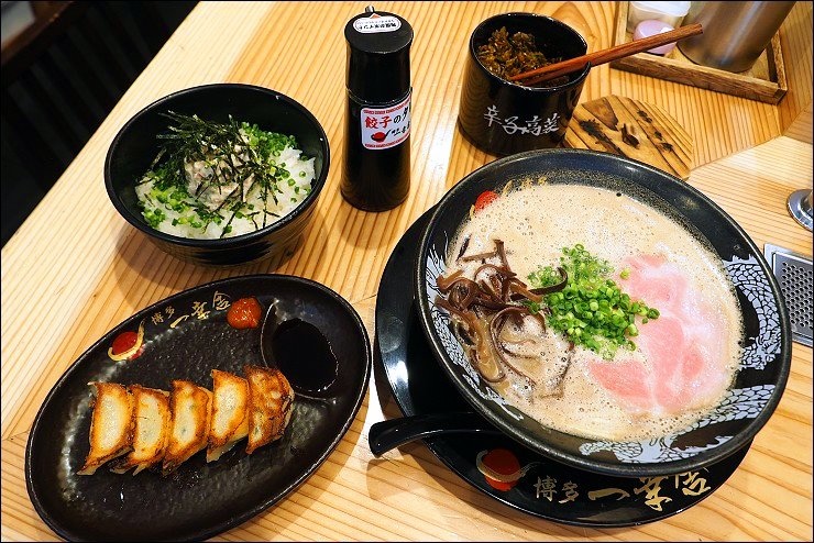店家招牌是豚骨白湯拉麵,店長推薦菜色是塘心蛋叉燒豚骨拉麵,人氣No.1是塘心蛋豚骨拉麵,我們點了博多套餐(1000日圓)連餃子、飯都可以一網打盡。