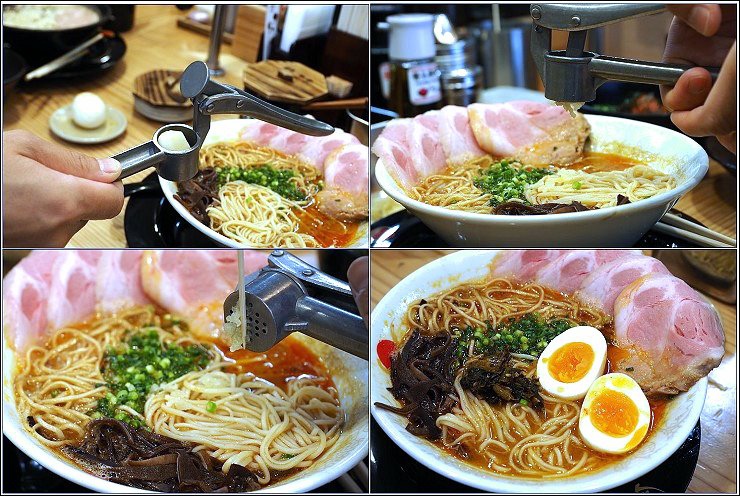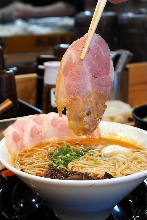 博多一幸舍的拉麵有三種湯頭,白湯、紅及黑湯,都是以白湯湯頭為基底,再加入不同的醬料熬製而成;紅湯是加入明太子的海鮮醬,黑醬則是店家特製的焦炒蒜香油。明太子是福岡名物吔,紅湯有加明太子,又有辣度,我的首選就是這一味!