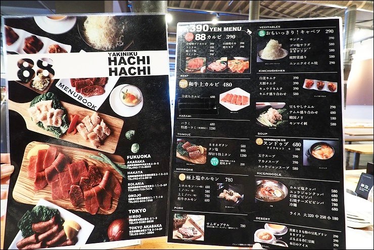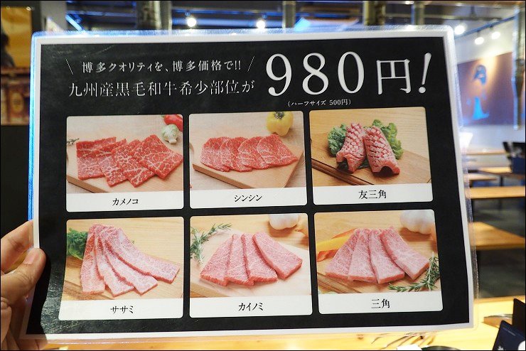 目前七輪燒肉博多店只有日文及英文菜單,之後會提供中文菜單唷!菜單上主要菜色都有照片,看照片點餐很簡單。菜單上價格很親民吔,和牛上等肉只要480日圓就吃的到!更讓我眼睛一亮的是九州產黑毛和牛希少部位只要980日㘣的菜單,這不點怎麼行,看完菜單真的覺得可以放心的點下去了!不怕荷包大失血。對了,菜單上的價格都是未稅,結帳要加稅。