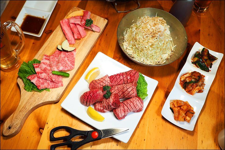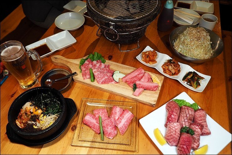 很快地我們點的菜色都上桌啦!高麗菜絲、泡菜拼盤、還有厲害又不貴的希少部位和牛、上等牛五花拼盤、厚切特上級牛舌、石鍋拌飯。