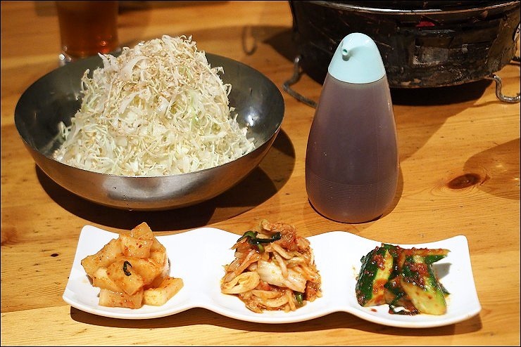 大份量生菜高麗菜絲(290日圓)有淋上香油及白芝麻,泡菜組合(580日圓)有小黃瓜、泡菜跟白蘿蔔,三種味道都醃的不錯,小黃瓜跟白蘿蔔含不少水份,吃起來好開胃呀!