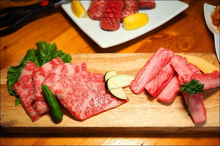 先來烤油花多多的牛五花拚盤(1980日圓),二種都是牛五花只是切法不同,牛五花就是油脂滿滿,入口油嫩美味,一般都是吃到切薄片的牛五花,這裡的厚條狀牛五花第一次吃,口感更強烈,好好吃呀,像我愛大口吃肉的人愛慘了,我一個人吃一份完全沒有問題!