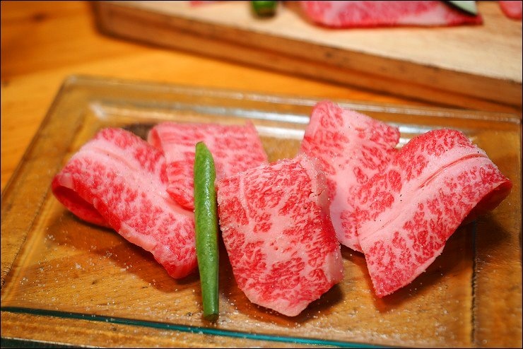 希少部位(980日圓),這份是牛腹肉靠後腿的希少部位,油花分布美美的,沒有事先醃過,只有簡單撒一點塩而已,新鮮的肉就是要吃原味。