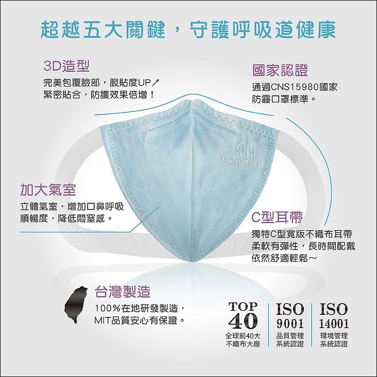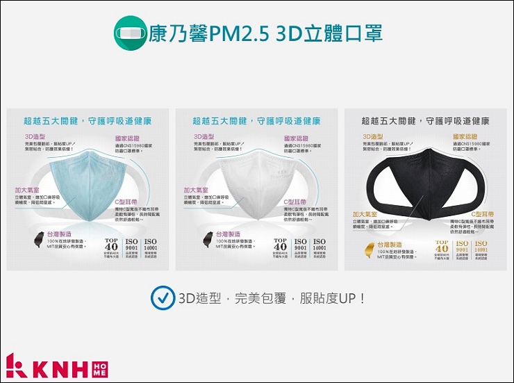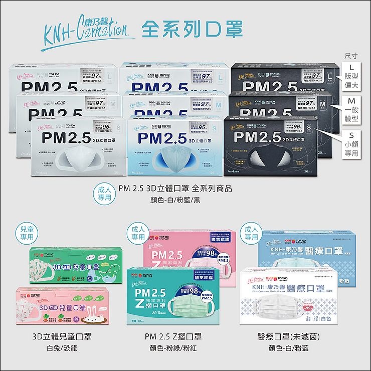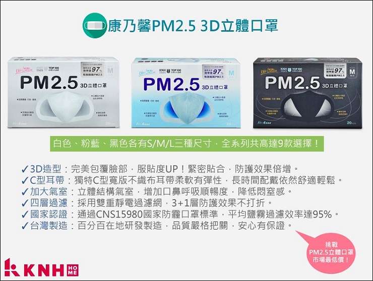 大人的3D立體口罩共有三色三種尺寸,分別是粉藍/白/黑及S/M/L,全部台灣製造,皆通過國家防霾口罩標準,符合CNS15980 C/D級標準。