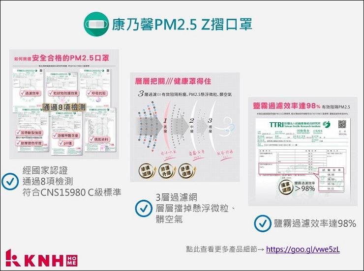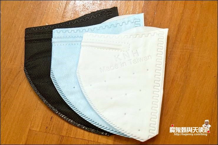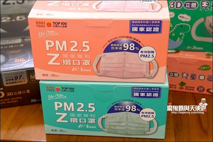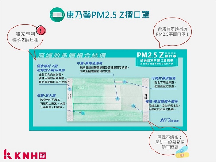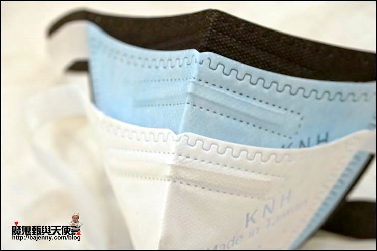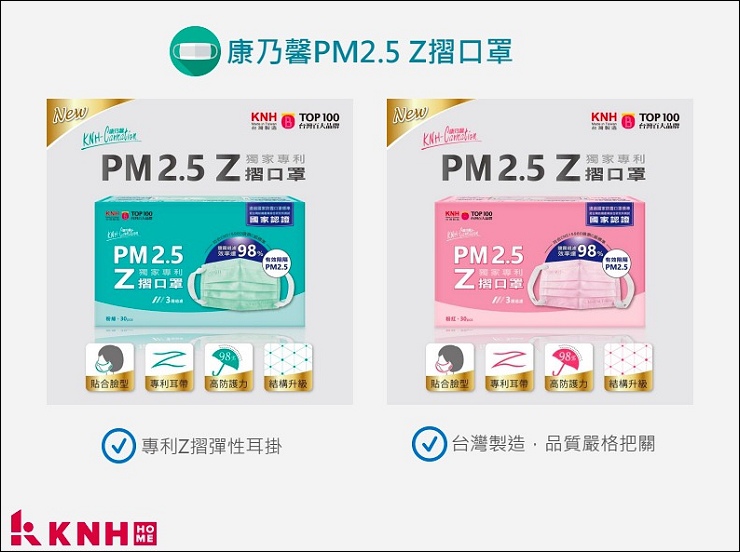 KNH也有最常見的Z摺口罩有兩色,跟3D立體口罩的差別在形狀、密合度及過瀘層,最大特點是特殊Z摺耳掛。