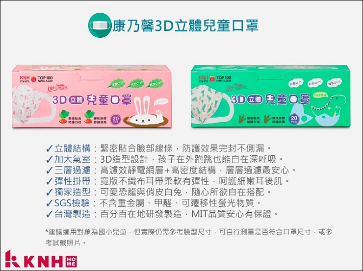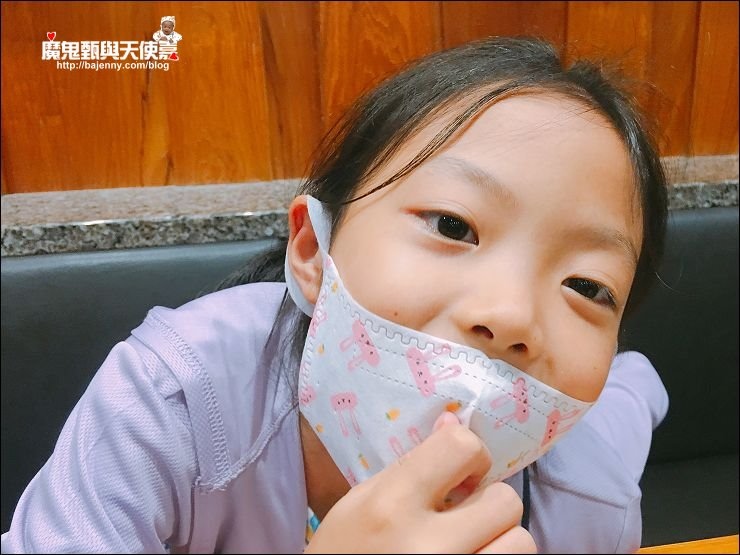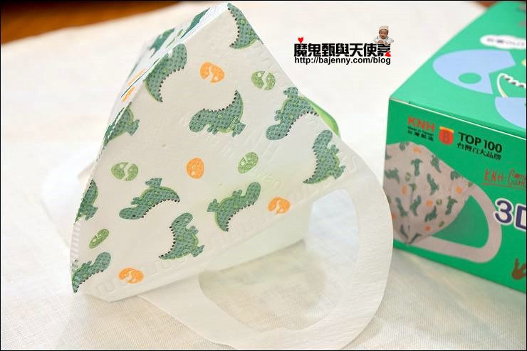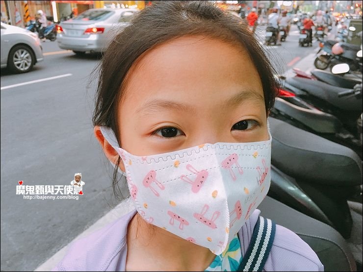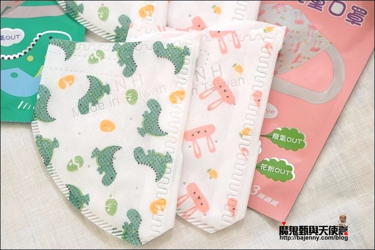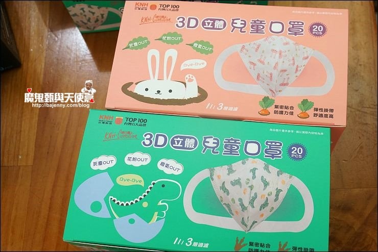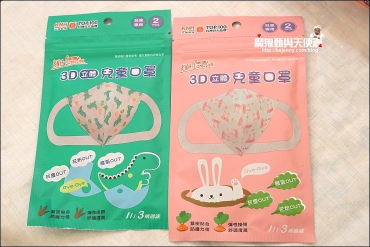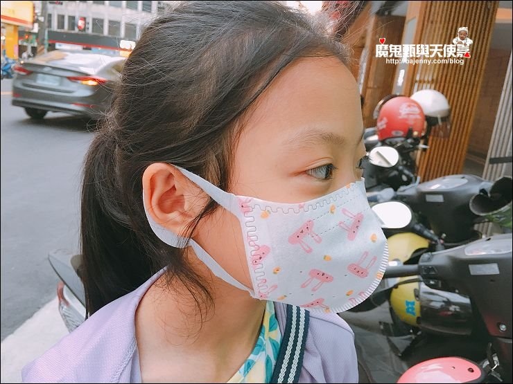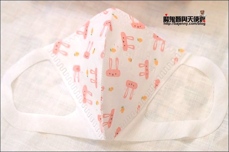 兒童口罩有兩種圖案可以選,基本就是分男女款,小女生就是小白兔、小男生就是恐龍,妹妹現在三年級9歲,戴兒童口罩蠻剛好的!