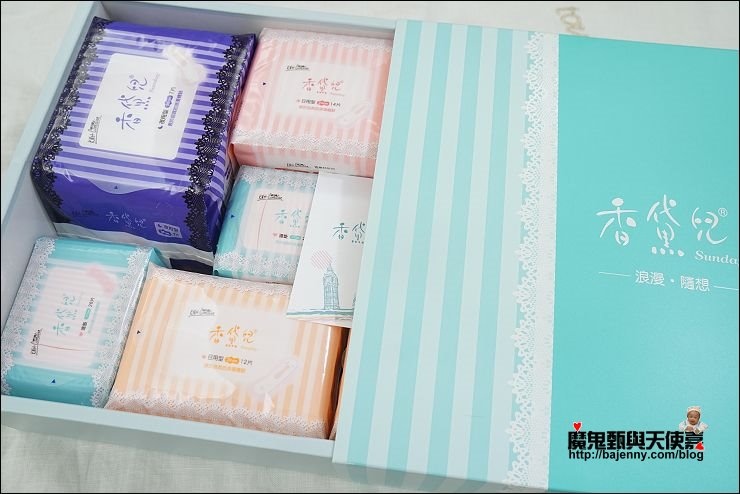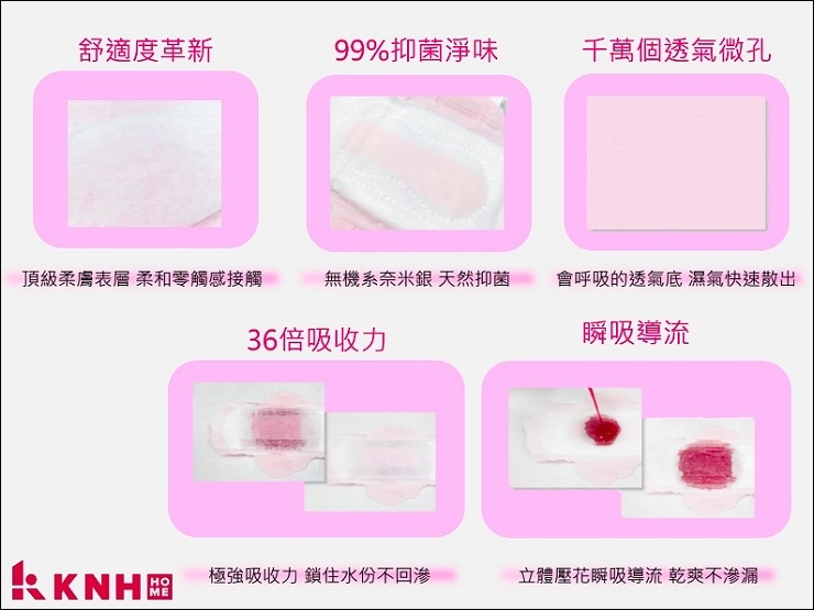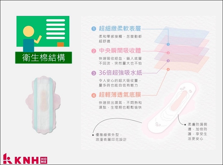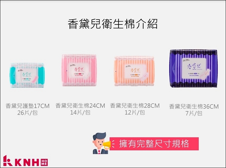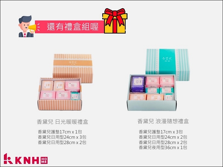 KNH HOME生活選品禮盒有兩種包裝,我拿到的是浪漫隨想禮盒,內容物有17cm護墊3包、24cm及28cm各2包、36cm夜用1包,