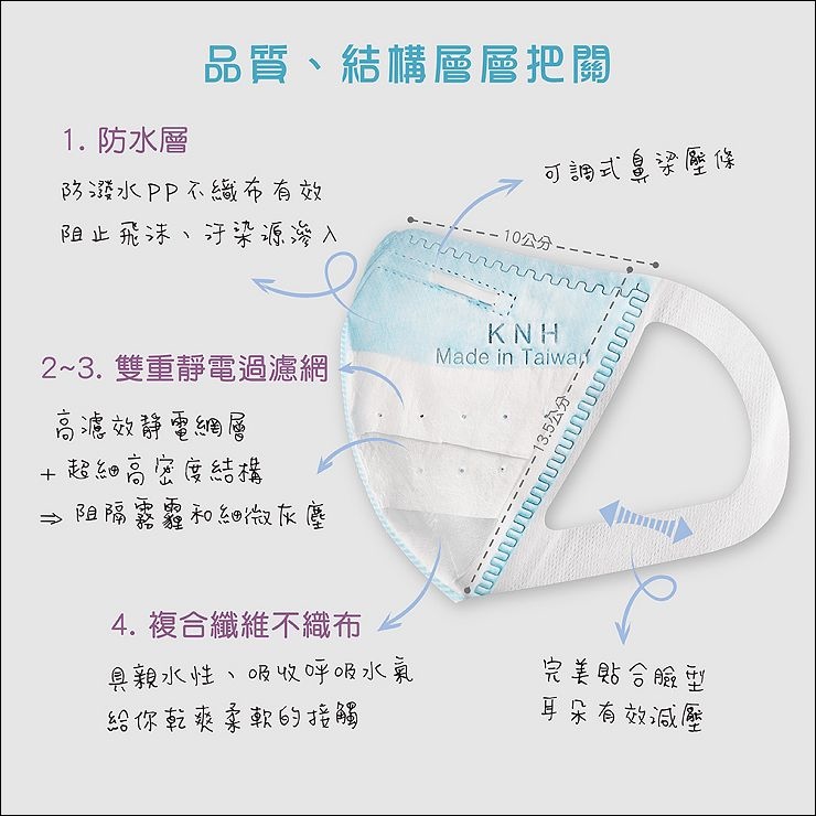 3D立體口罩構造共四層,有防水層、雙重靜電過瀘網及具親水性的複合纖維不織布,四層防護層層過瀘PM2.5細懸浮微粒,只是不建議水洗喔!水洗會破壞中層靜電過瀘網的帶電效果,進而影響過瀘效能。