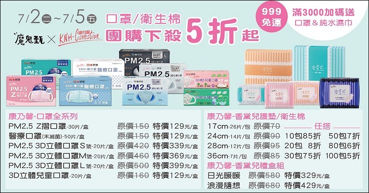最近感覺溫度每天都在創新高,熱死啦!走在路上如果沒有撐陽傘根本受不住,騎車更是全身要包緊緊,不然皮膚曬到會痛!只是夏天布口罩真的快戴不住啦,這次團的台灣製康乃馨不織布防霾口罩,有3D立體口罩(成人及兒童)跟一般Z摺口罩,成人的立體口罩及Z摺口罩都是PM2.5口罩,皆通過國家防霾口罩標準,符合CNS15980 C/D級標準,可以有效對抗空汙及保護自身不因吸入過多PM2.5而對健康造成影響,基本上這是機車族及通勤族出門必備!!另外社團一直對生活用品需求量大,這次幫大家爭取到姐姐妹妹每個月都要固定採買的衛生棉,本次開團的香黛兒衛生棉是康乃馨的最新系列產品,不論在吸收力、透氣度、乾爽不回滲程度的功能都再提升,表層相對柔軟,並添加奈米銀增加抗菌力,買越多省越多,十包八五折、二十包八折、100包五折,以28公分的衛生棉來說最低一片3.96元左右,姐妹們快快揪團買起來~~