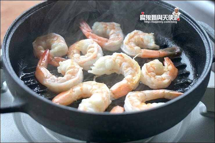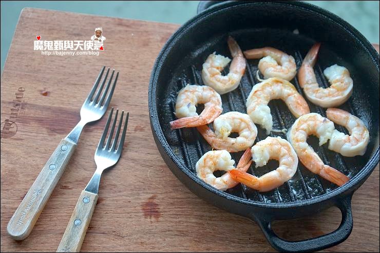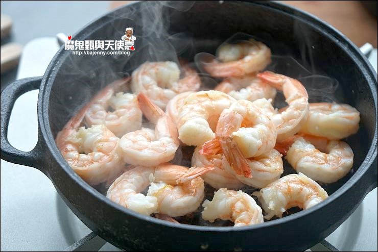 蝦仁擦乾水分,鐵鍋倒入些許橄欖油熱鍋,乾煎至熟,灑點鹽;
