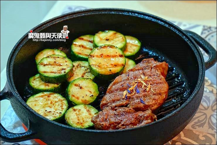 煎牛排記得冷鍋時先均勻上油,再開中火熱鍋,溫度上升後放入牛排,中火才能有漂亮的紋路,三分熟的牛排大約兩分鐘翻面再煎一分鐘灑上海鹽黑胡椒即可,以防鐵鍋持續加熱,最好將牛排取出(以免牛排過熟),此時可用鍋子裡的油小火煎櫛瓜或喜歡的蔬菜當side dish。