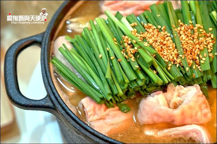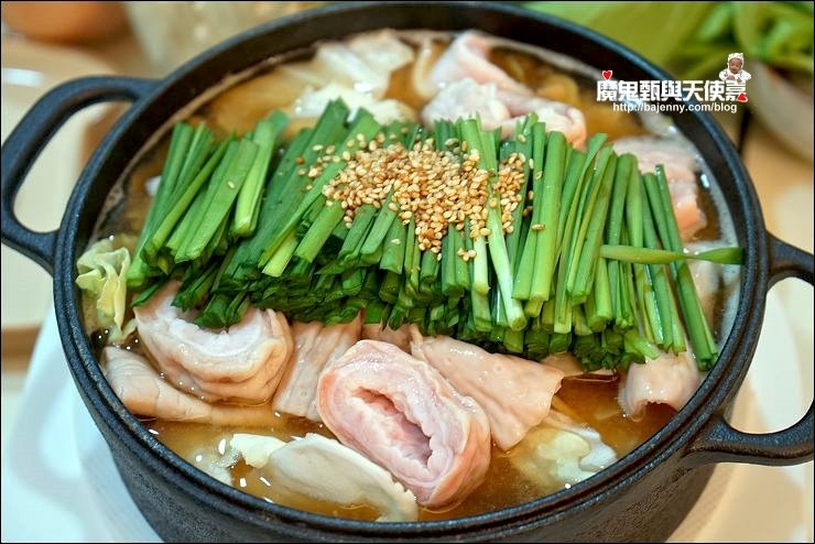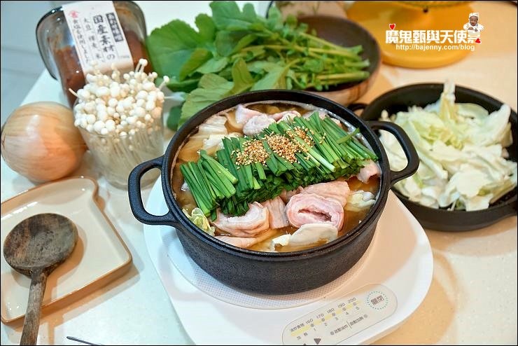 在市場買不到牛腸,豬大腸夠肥嫩一樣美味,將豬大腸、高麗菜、韭菜、豆腐、金針菇、洋蔥、蘿蔔葉、松阪肉、北海道昆布高湯包等備好在一旁,先用一包高湯包煮滾高湯,放入一大匙味噌拌勻(要注意的是用冷水才能將味噌調散,不然會喝到結塊的味噌),加入大腸高麗菜豆腐洋蔥,熬煮十分鐘後鋪上韭菜白芝麻,最後加入松阪肉,煮滾即可。