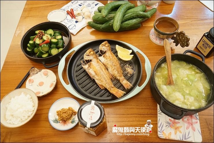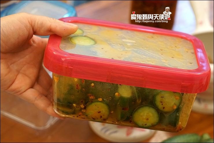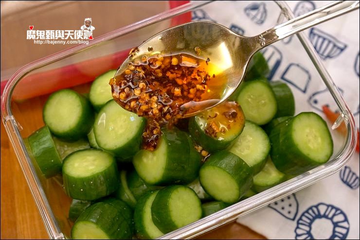 鐵鍋除了拿來料理,裝飾擺盤也很讚!夏天我們家也很常做冰鎮小黃瓜,有辣度更開胃,調味就用團過的oxo保鮮盒超方便,密封甩一甩冰在冰箱就好了。