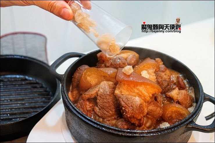 將兩斤豬腿肉皮面朝下乾煎會逼出豬油,利用豬油將豬皮炸酥,滷過後會比較Q彈,大約20分鐘後倒入80cc紅藜醬油熗鍋,加入100cc米酒燉煮40分鐘,35分鐘時加入20g紅冰糖,持續攪拌讓紅冰糖融化,肉上焦糖色,攪拌約兩分鐘關火上蓋用餘溫融化紅冰糖。