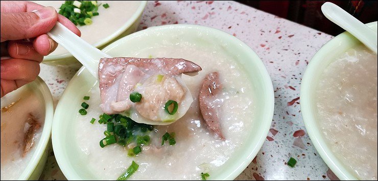 豬心粥,豬肝有厚度而且沒有煮全熟,利用粥的熱度讓它熟度增加,豬肝起來有嫩,大家搶著吃。