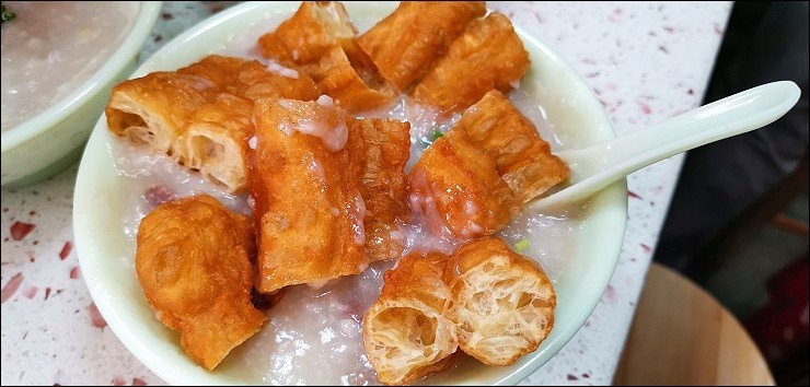 上樓梯看到店家的油條就想點!牛肉粥被油條蓋滿滿,不用一口氣加這麼多啦,一二塊油條慢慢配著吃就好,皮蛋瘦肉粥也不錯,另外招牌及第粥料多多,有肉丸、粉腸、豬肚、豬肝,喜歡料多的朋友就點這碗。