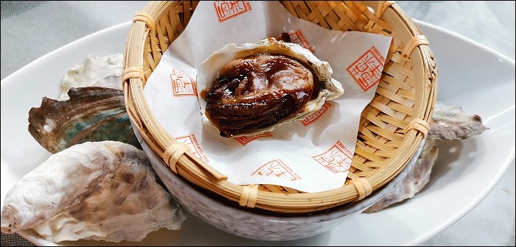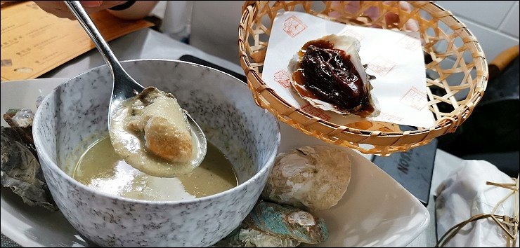 生蠔忌廉濃湯,大家知道蠔是澳門的重要特產之一嗎?以前澳門有「濠鏡」之名,舊澳門以採蠔為主要產業。這道菜使用在地的蠔油調製的蠔,上頭這顆是烤過的蠔,打開後下面碗裡還有用蠔打成的奶油濃湯,超級鮮,濃湯入口是滿滿的鮮味,超級補,裡頭大顆的蠔吃起來爽度很高。