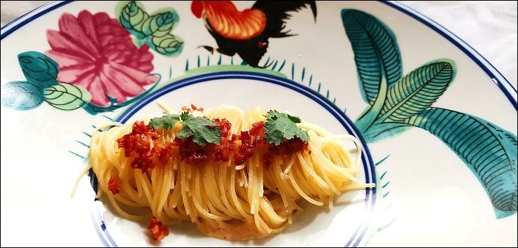 葡國腸西洋蝦子麵,不要以為看起來份量不大,吃起來可是很有份量的唷!主要是義大利天使麵,上頭是用碎末葡國腸鹹香度很夠,混著有口感不軟爛的天使麵,好吃,這道料理有澳門中西文化融合之意。