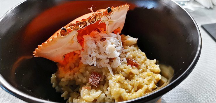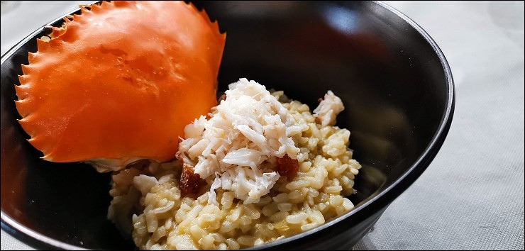 我最愛的是這道新鮮澳門水蟹義大利燴飯,位處鹹淡水交界的澳門盛產水蟹,來澳門一定要吃水蟹,這回我終於吃到啦!!水蟹的肉質細緻鮮美。這道燉飯以水蟹熬高湯來煮,紅通通的水蟹打開之後,有不少水蟹肉吔,吃起來好鮮美,飯也是滿滿的蟹味,老闆,再來一碗!!!