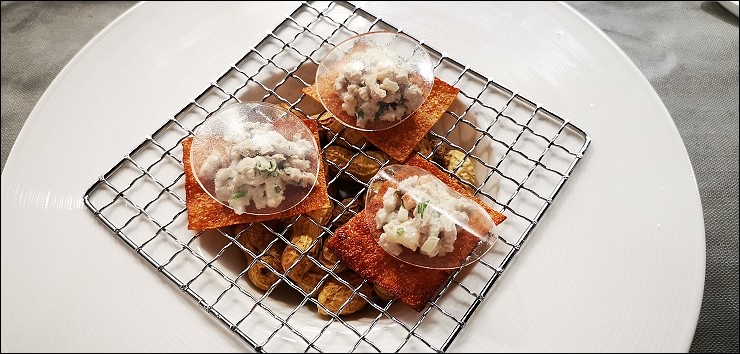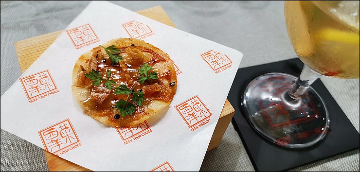 葡萄牙啤酒豬肉乾雲吞,以澳門伴手禮豬肉乾底基底,上頭覆蓋一片以啤酒製成的透明 薄膜稱為“雲吞皮”,我喜歡酥香的豬肉乾,但雲吞皮帶點啤酒的苦味,口味我不是很合味。